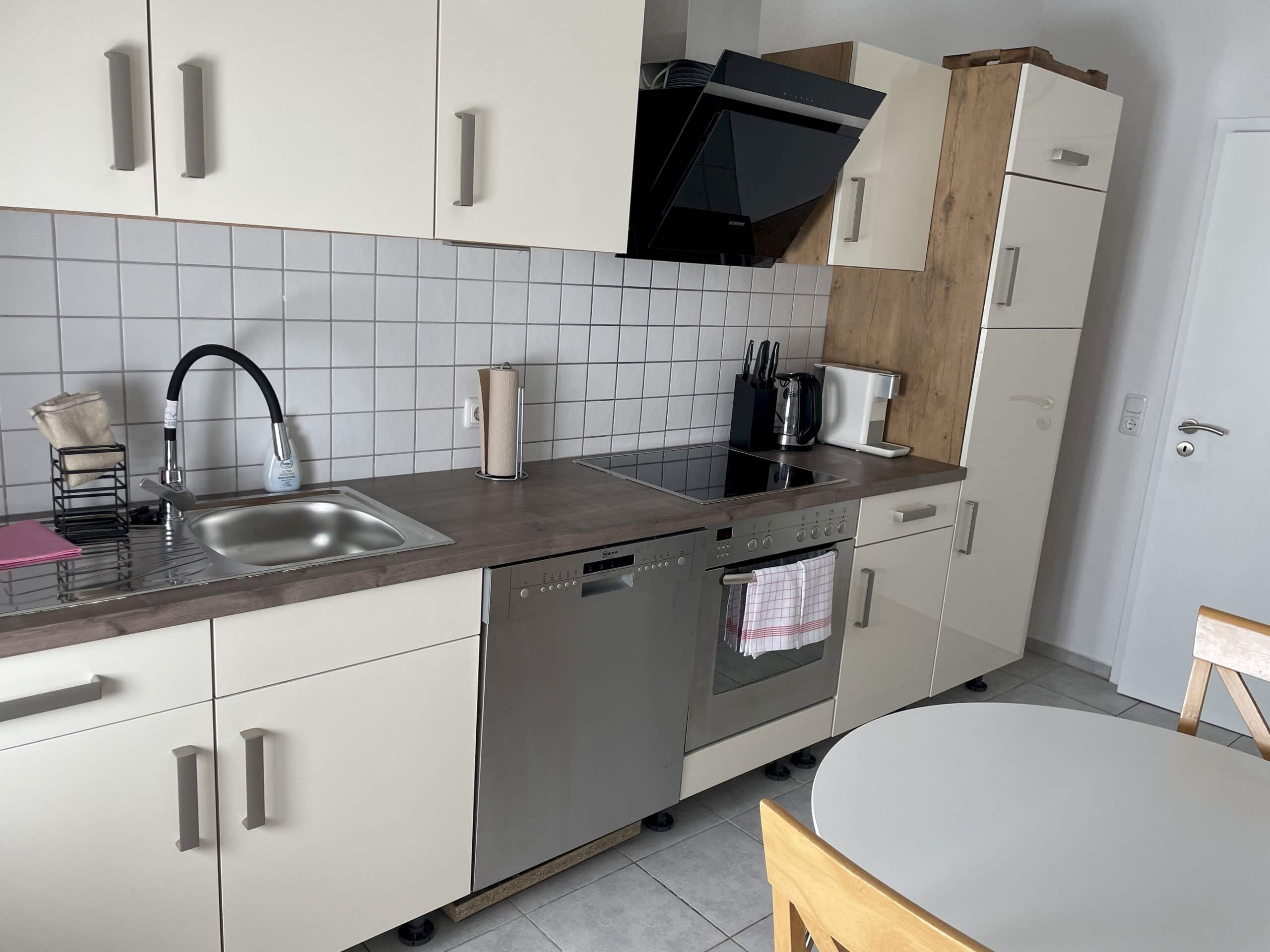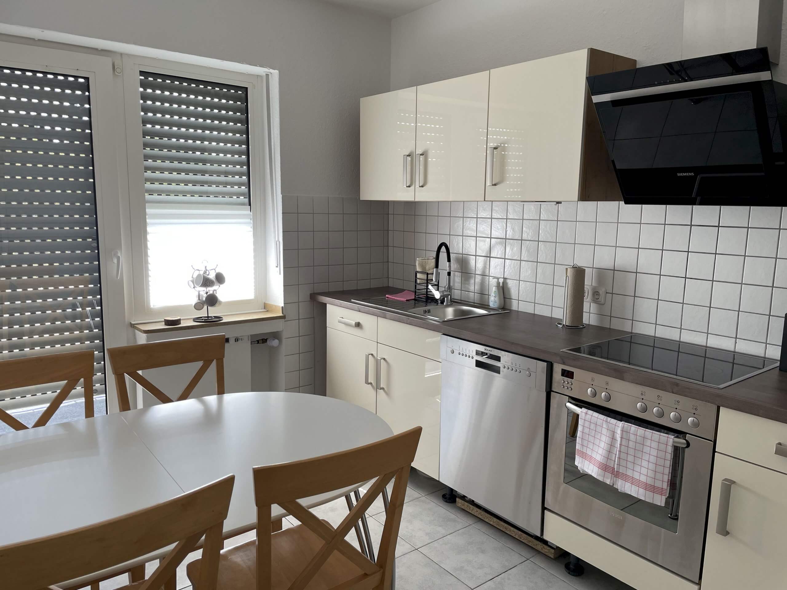 Kochen & essen: Voll ausgestattete Küche mit Herd, Backofen, Spülmaschine, Kaffeemaschinen und allem nötigen Geschirr. Der Essbereich bietet Zugang zum Balkon – perfekt für ein Glas Wein bei Sonnenuntergang.